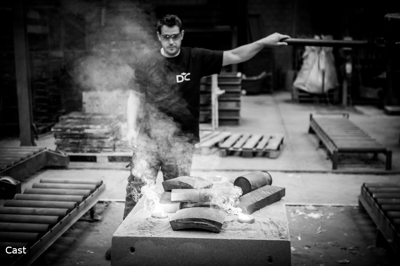 Everyone knows that building a sand castle with dry sand does not work well. Something has to be added to the sand, on the beach as well as in a foundry. We work with moulds that are made either in "green sand" (sand + water + clay) or in "chemical sand" (sand + resins + hardener). Both are easily recycled and re-used, without any risk for the environment.